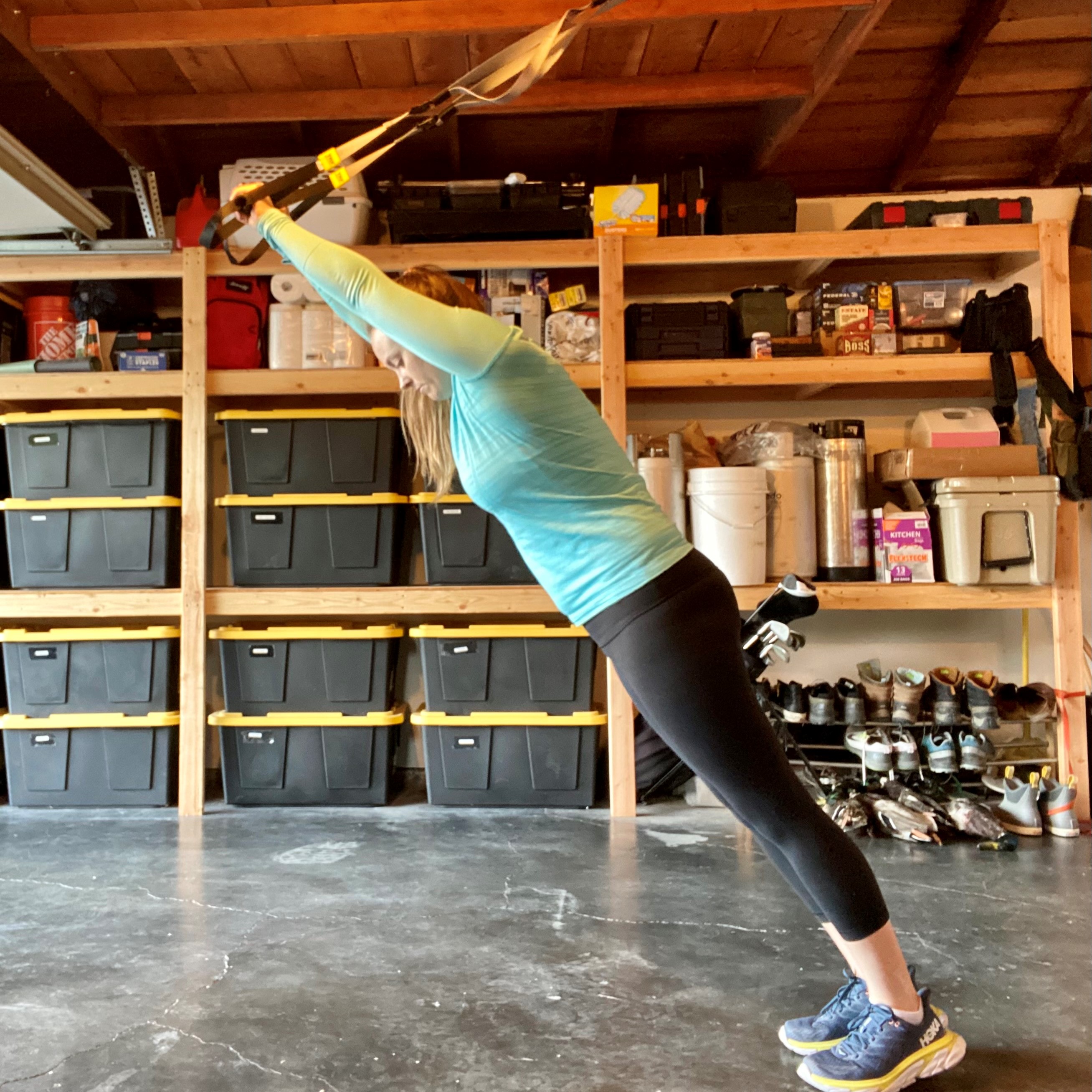 Pistol Squat: 1. Holding onto the handles, extend one leg straight out, flexing the foot up towards the sky. Squat down on the standing leg until the leg is at 45 degree angle. 2. While pushing into the heel of the leg and squating up, engaging the biceps pull up assisting with the squat, the elevated leg bends at a 90 degree angle at the knee, knee up towards the torso. 3. Pivot forward at the hips, shooting the elevated leg out behind, arms shoot out in the opposite direction, elbows next to the ears. Switch legs.