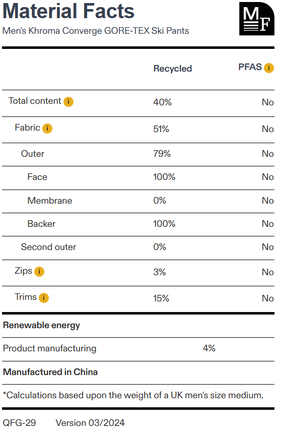 - Main fabric: 80D Recycled GORE-TEX 3-layer construction ePE waterproof technology with PFCec free DWR (167gsm) HH: 28,000mm/RET: <13