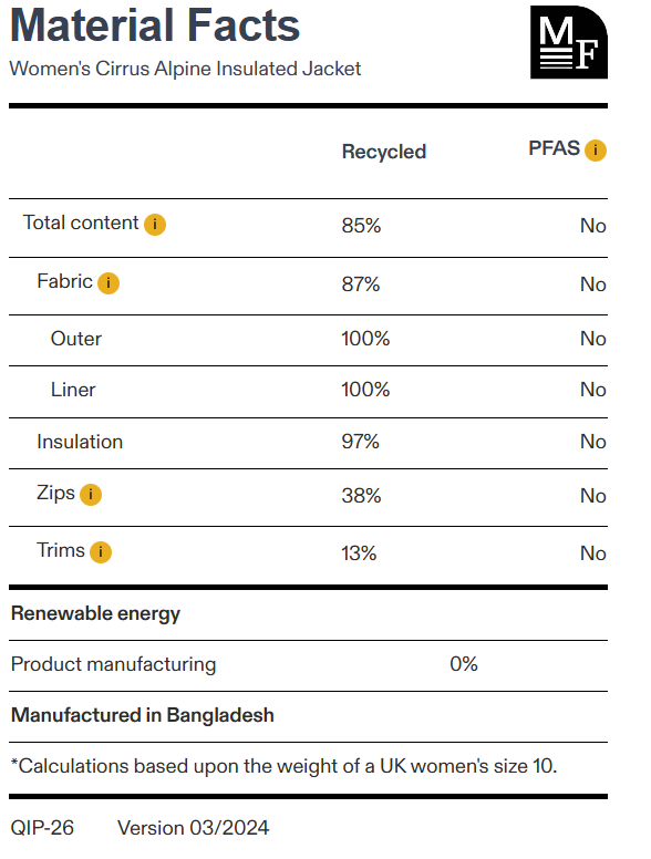 - Insulation: PrimaLoft® Silver RISE 100% recycled synthetic insulation (6.7oz / 191g, UK size 10)