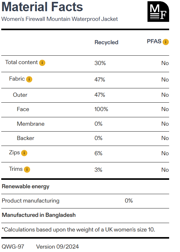 • Main fabric: 40D Pertex® Shield 3-Layer construction waterproof technology with fluorocarbon-free DWR (133gsm) HH: 20,000mm/MVTR: 20,000 g/m2/24hrs